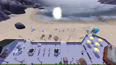 In my never-ending quest to expand my Sims 3 creation resume, I have decided to share a community lot. I wasn't originally intending on creating a community lot for sharing but (a) I really needed a community lot with more to do so as to attract more Sims (b) I love the beach, (c) the default beach lot was boring, and (d) I think it came out pretty fabulous so what the hey.